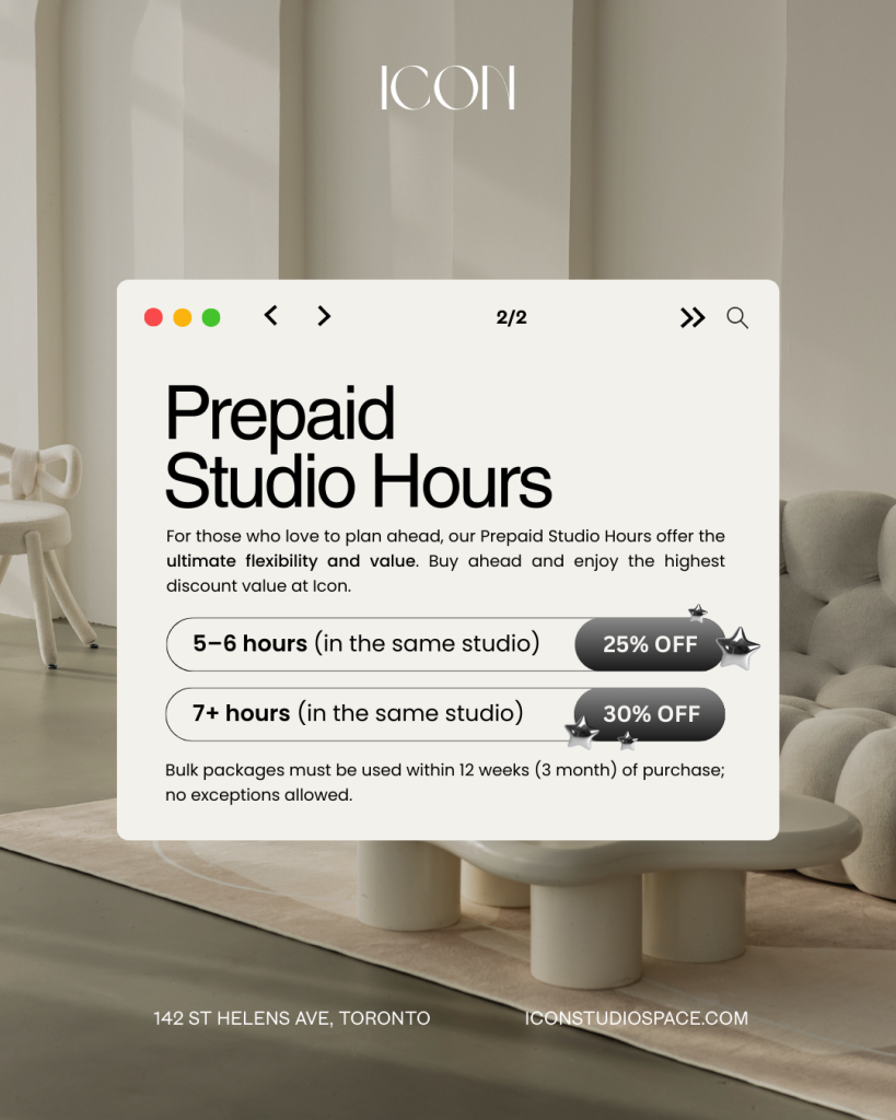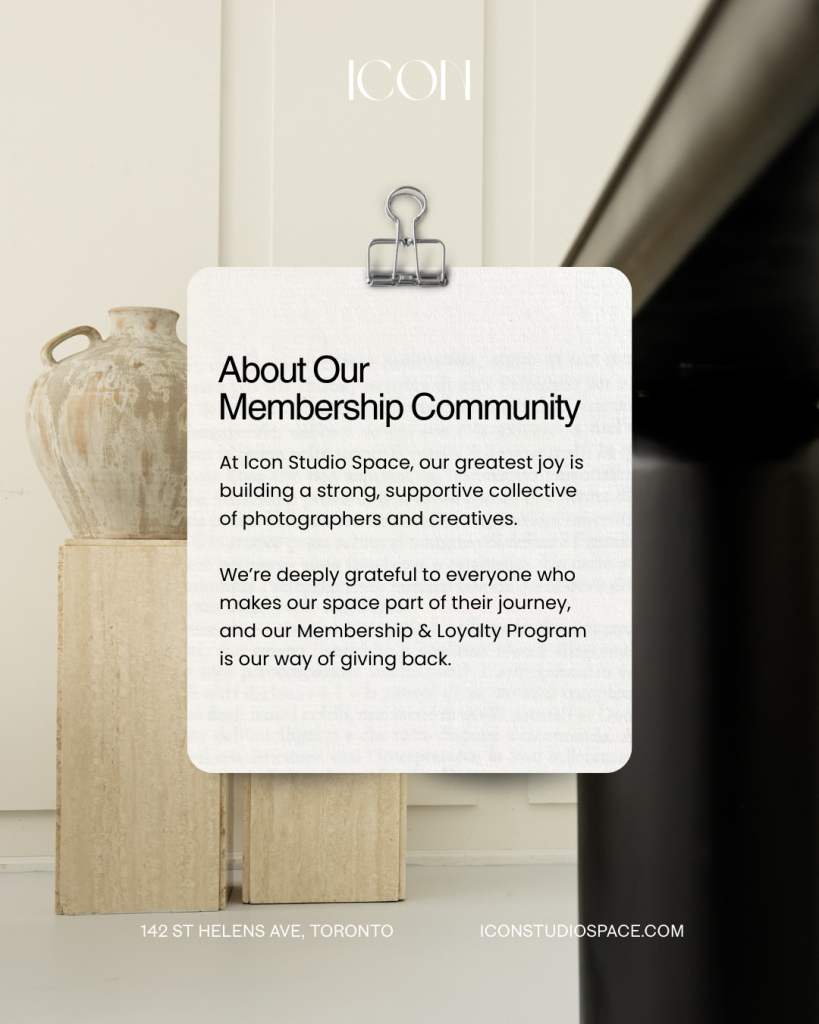 At Icon Studio Space, our biggest joy is building a strong, supportive community of photographers and creatives. We are so grateful for everyone who makes our space part of their journey, and our Membership & Loyalty Program is our way of giving back to you.